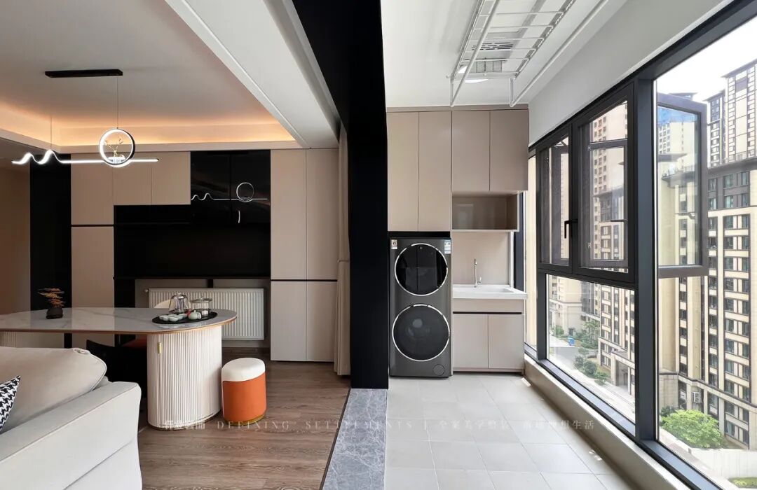 白色和木色的搭配打造了客厅的温暖底蕴,在此基础上,室内原有的隔断被拆除,大阳台纳入客厅,以更加开阔的形态展现在居住者面前,诉说着多元的美。