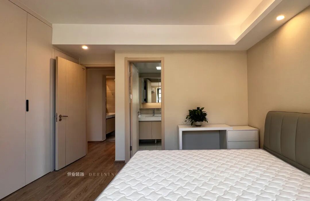 文化的含蓄反应在空间色彩上必定是低调内敛的,主卧所追求的安稳感、松弛感,在米色做墙面和天花的整体背景铺垫的过程中,已经为空间整体定调,温润怡然、治愈身心的体验势必从视觉上最先感知。