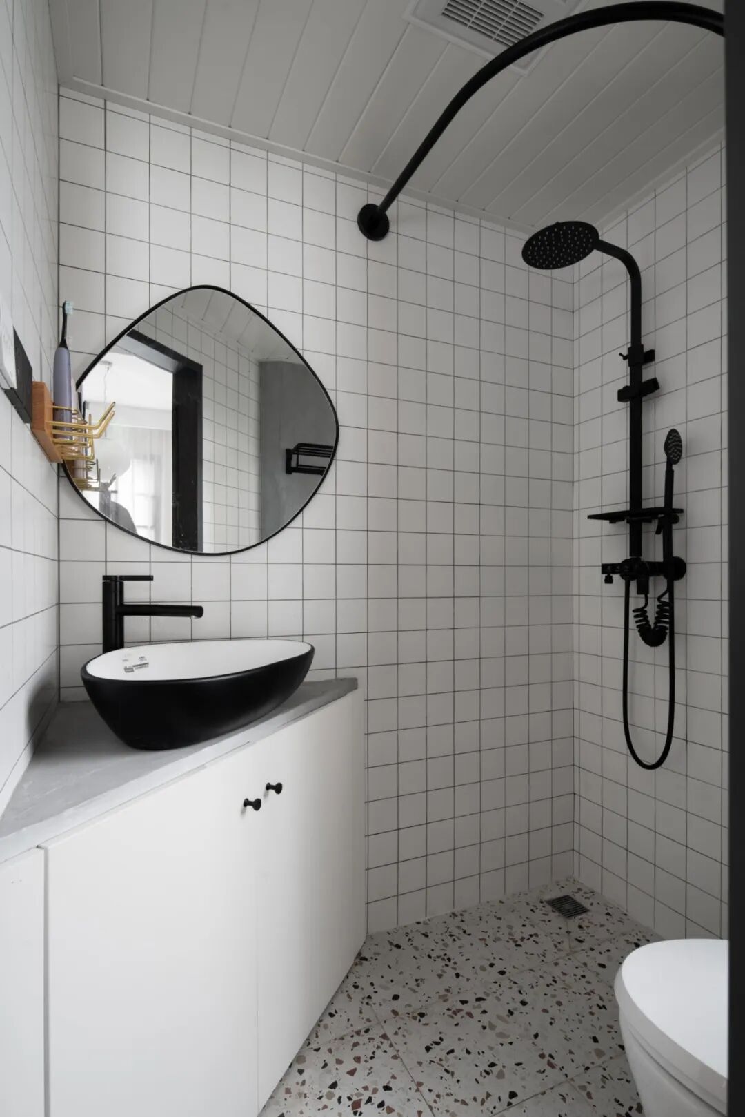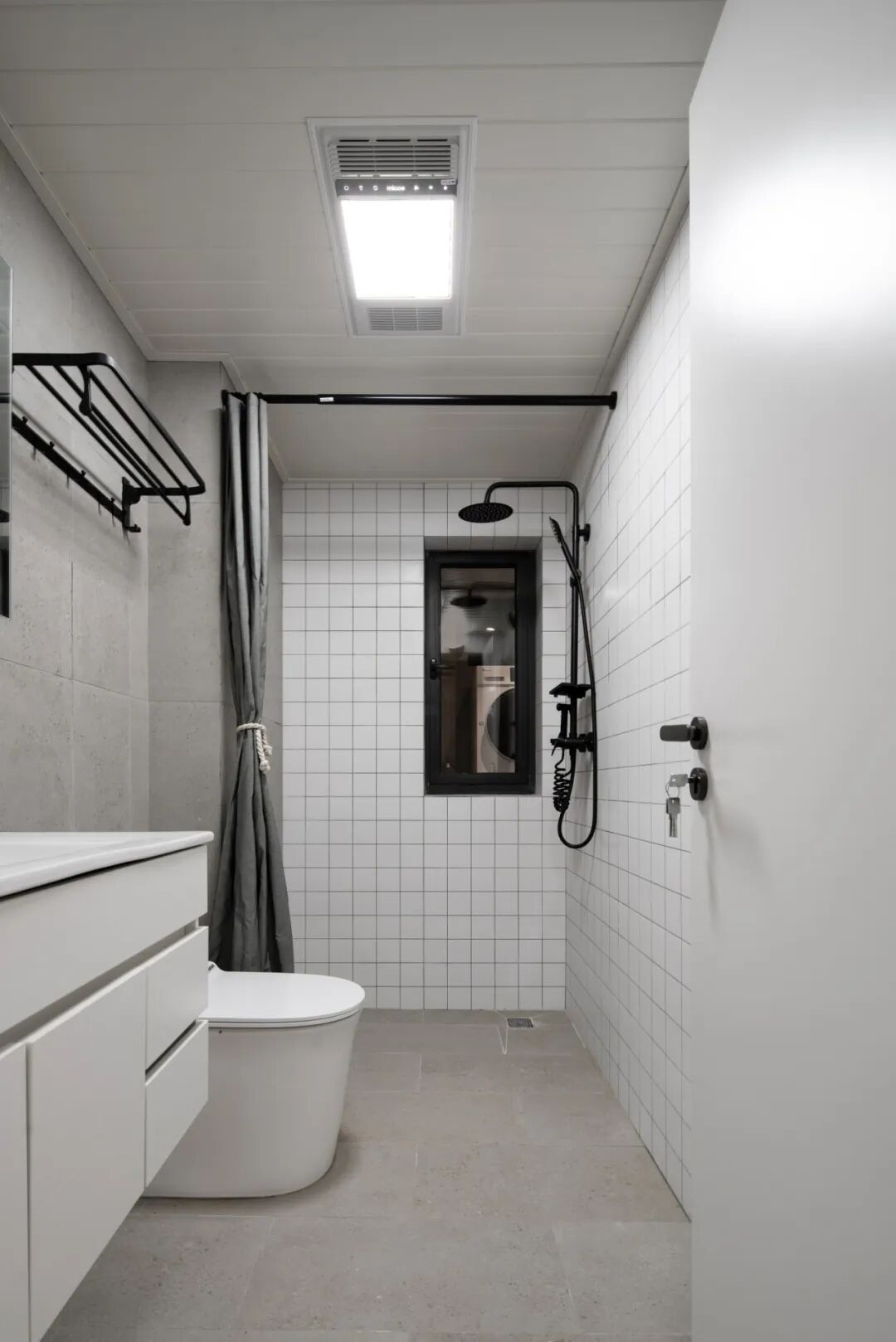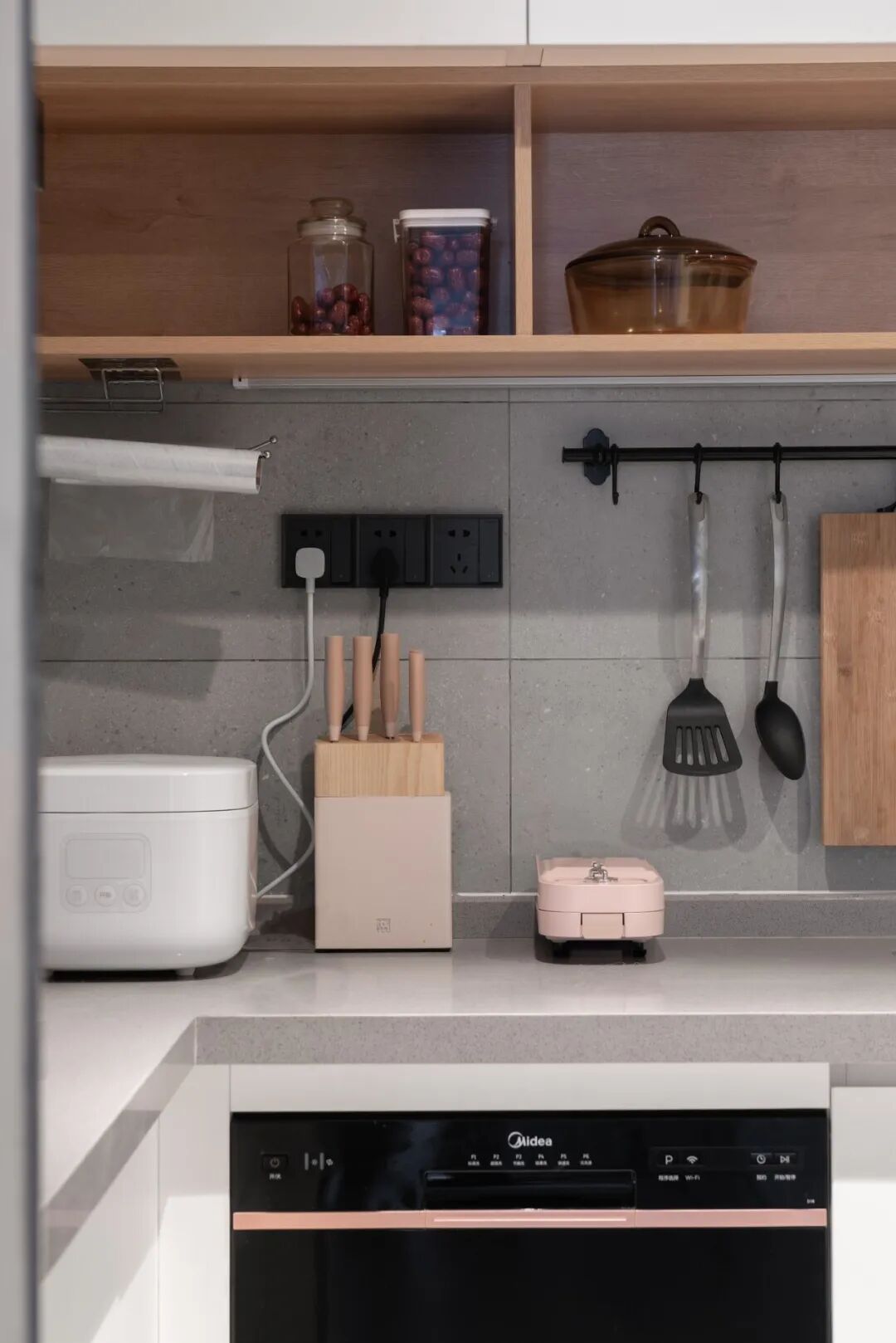 厨房功能丰富,居者偏爱烹饪,一人居只要满足基础中餐烹饪需求就好。黑框玻璃拉门内,是中式厨房,有效隔绝油烟侵袭,大理石台面给空间沉稳感。