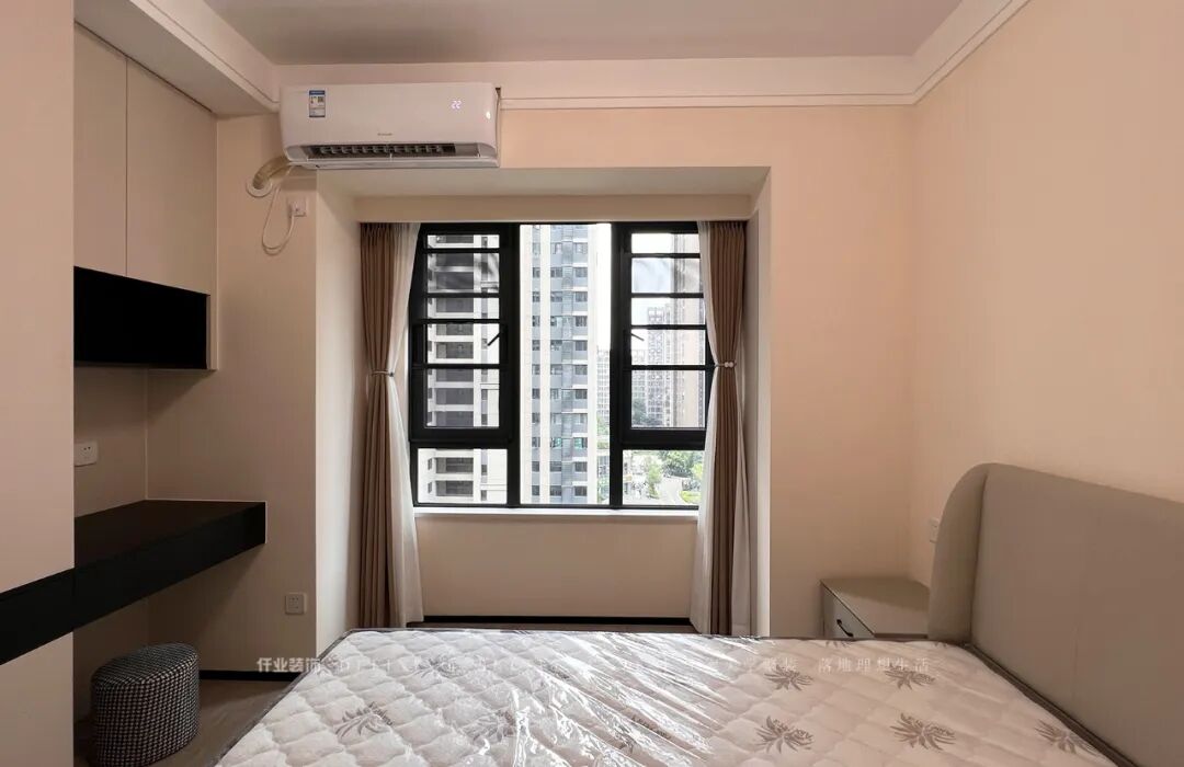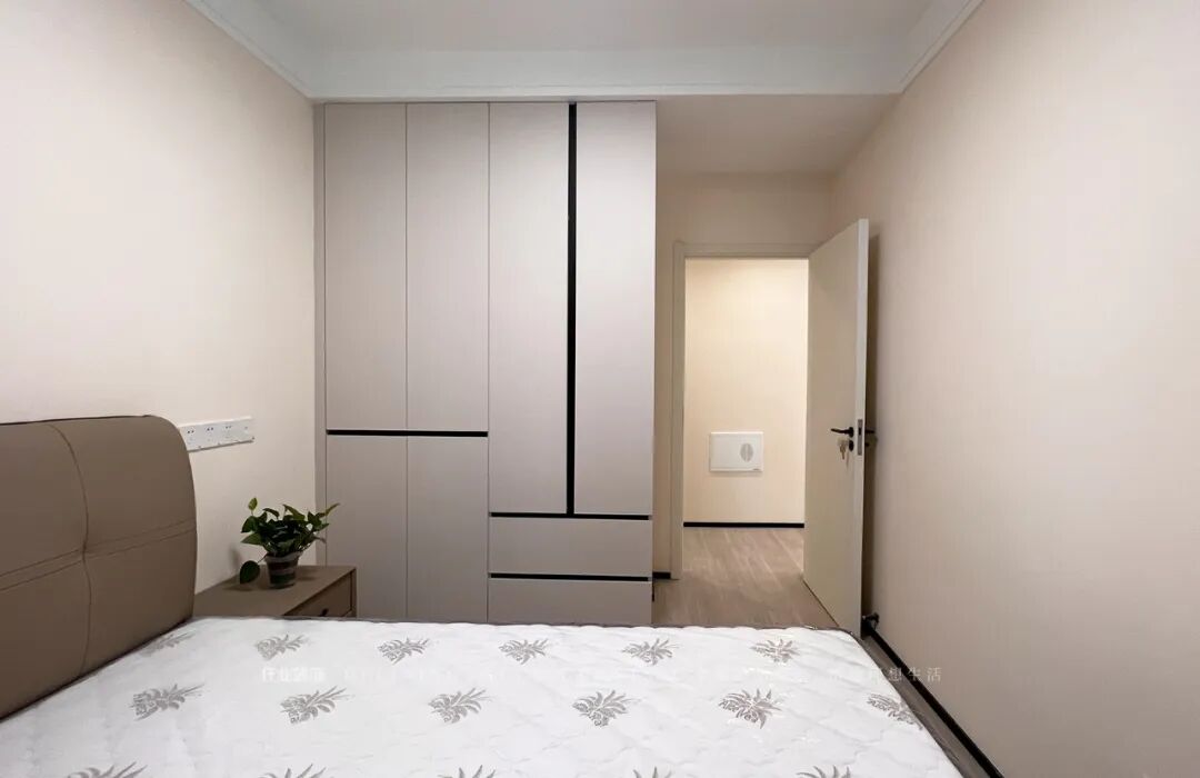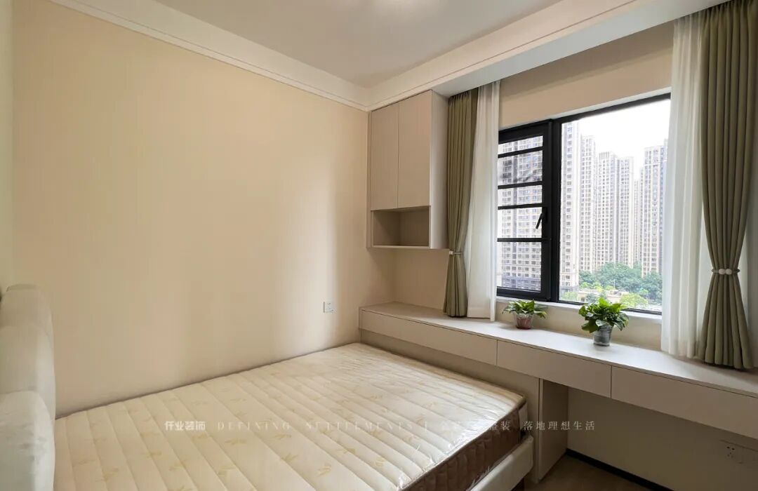 次卧结合实用性与氛围感营造,打造成一个宽绰舒适的学习睡眠空间,靠墙定制整墙悬空桌,床尾邻窗定制桌柜一体装置,巧妙增加收纳区域,也留下更多自由活动空间。搭配米白色软包材质,在克制的立面中玩味童趣。