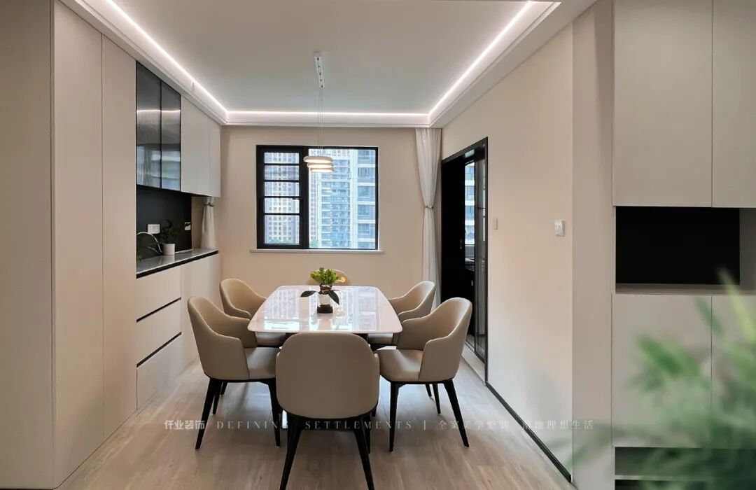 餐厅以大理石餐桌为中心,主色调依旧是米色。设计师巧妙布局了置物柜、天花板造型与软装进行过渡,完美地将客餐厅融合成和谐统一的空间。