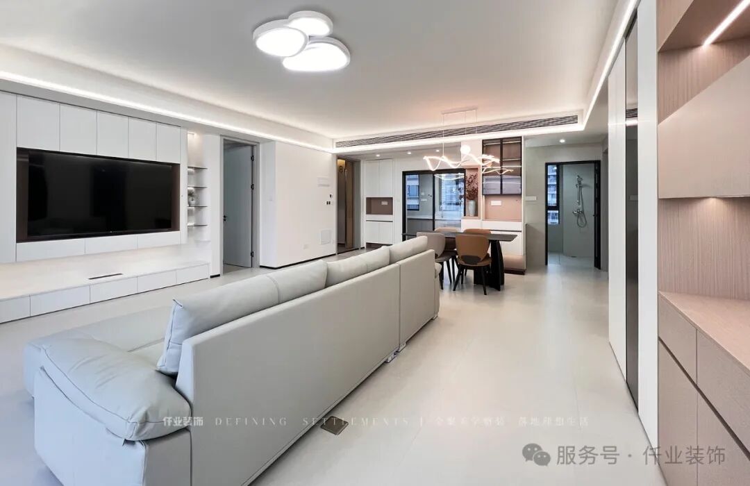 造型流畅的几盏主灯与无处不在的灯带,光影在厅间婆娑,温暖了家的港湾。