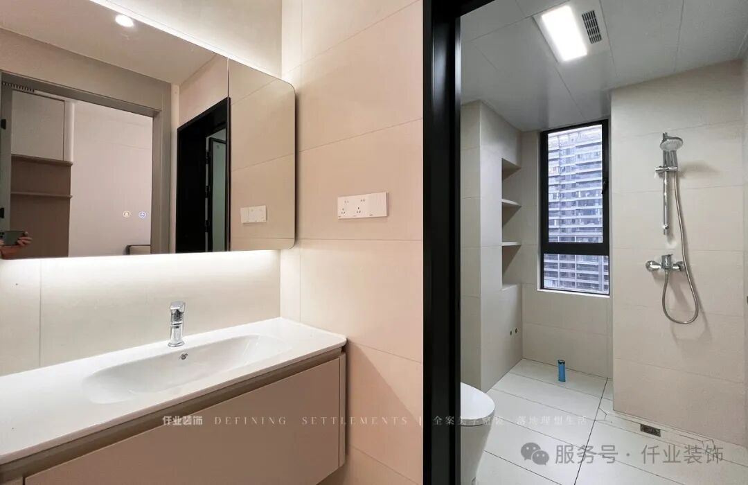 卫生间干湿分离,洗漱台上方大面梳妆镜伴有灯带给光,提升空间的明亮度,美观而实用。