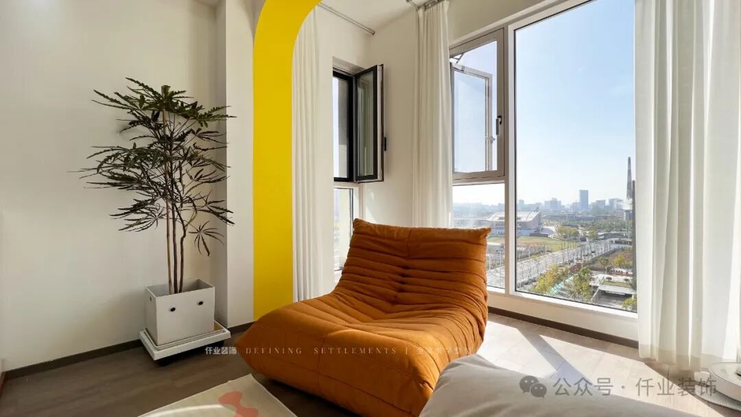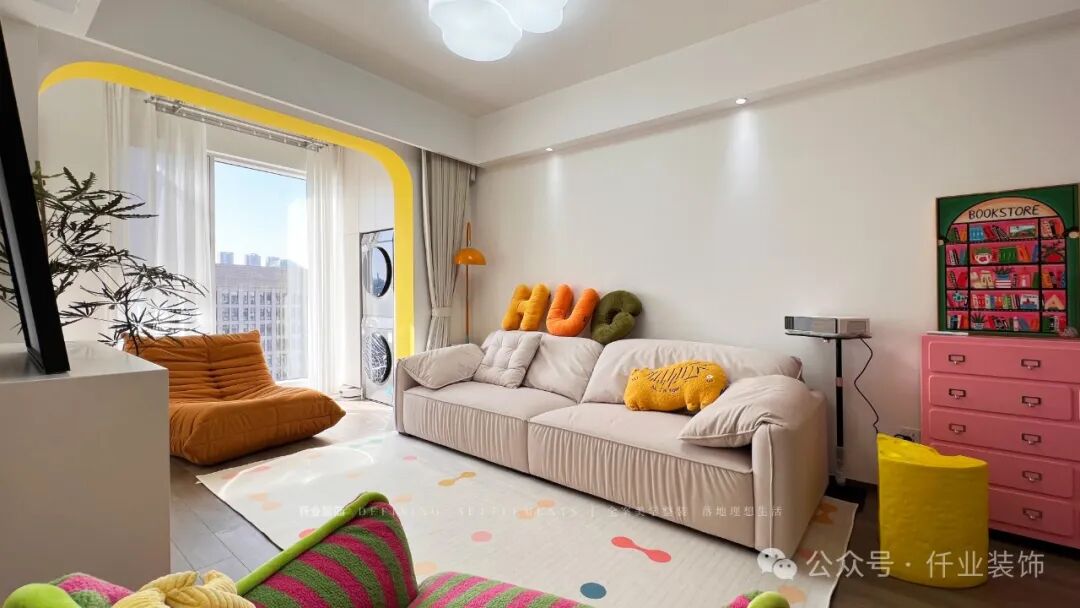 整个客厅区域将色块搭配的恰到好处,缤纷的色彩,明快又含有孟菲斯风格的艺术氛围跃然而现。
