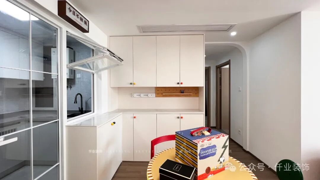 考虑到生活中的日常需求,在厨房外延增设L型柜体,厨房功能就此延伸。独特的折叠滑轨窗+“今日不做饭”,使餐厨空间变得活泼有趣起来。