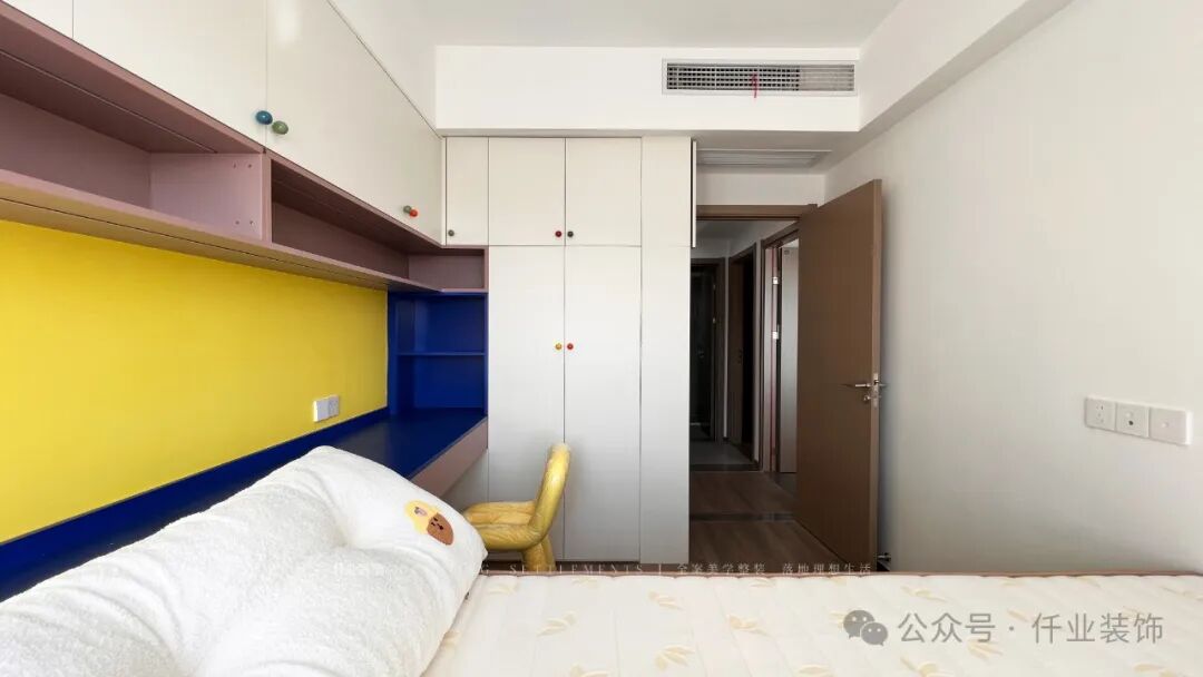 次卧书桌与连接墙上的色彩是设计亮点,搭配异形座椅、彩色拉手,颇具创意的组合搭配,透露出不羁与活泼的个性。