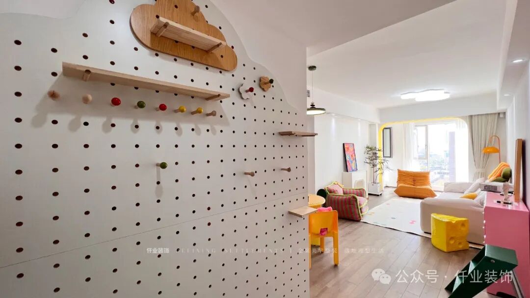 入室第一视角,是多彩的色块与和谐的组合。为了增加更多实用性与收纳空间,玄关的左侧是满墙洞洞板,样式美观大方,米白作底色,原木色点缀,融入整体风格。