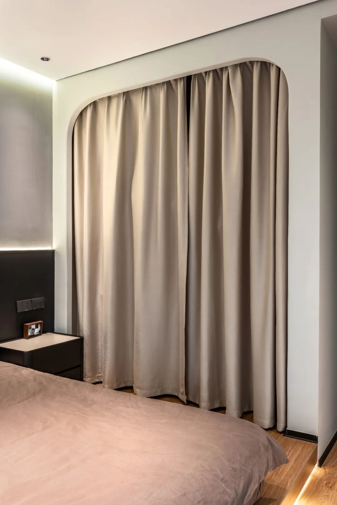 弧形拱门+香槟色遮光帘组成衣帽间,与睡眠区优雅隔开。