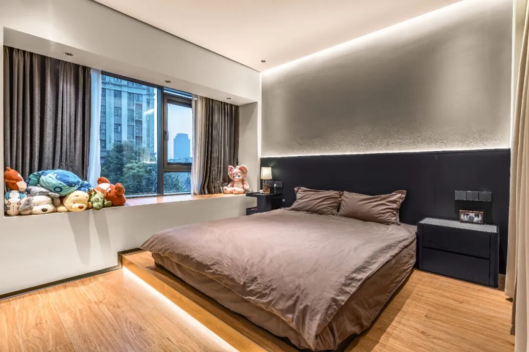 主卧以无主灯营造纯粹休憩氛围,半墙黑色床头背景衔接灰色墙面,嵌入式线性灯光勾勒出层次。