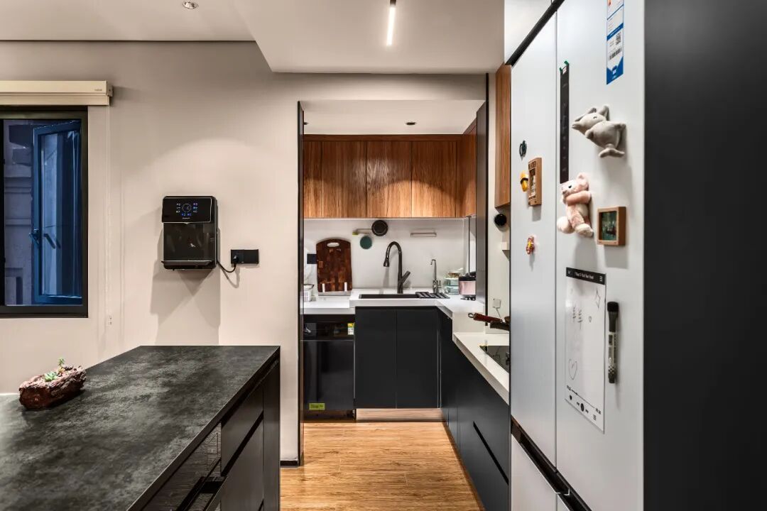 L型厨房洗、切、炒一气呵成,动线分明,高低台设计贴合人体工学。筒灯与线性灯精准布光,在黑白棕的和谐韵律中,效率与美感并存。