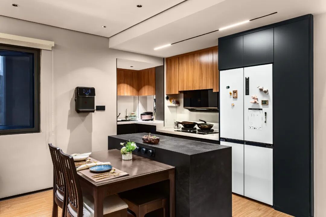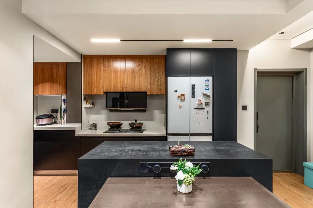 开放式格局串联起烹饪与社交,餐厨一体空间内,黑色石质岛台与胡桃木餐桌衔接。