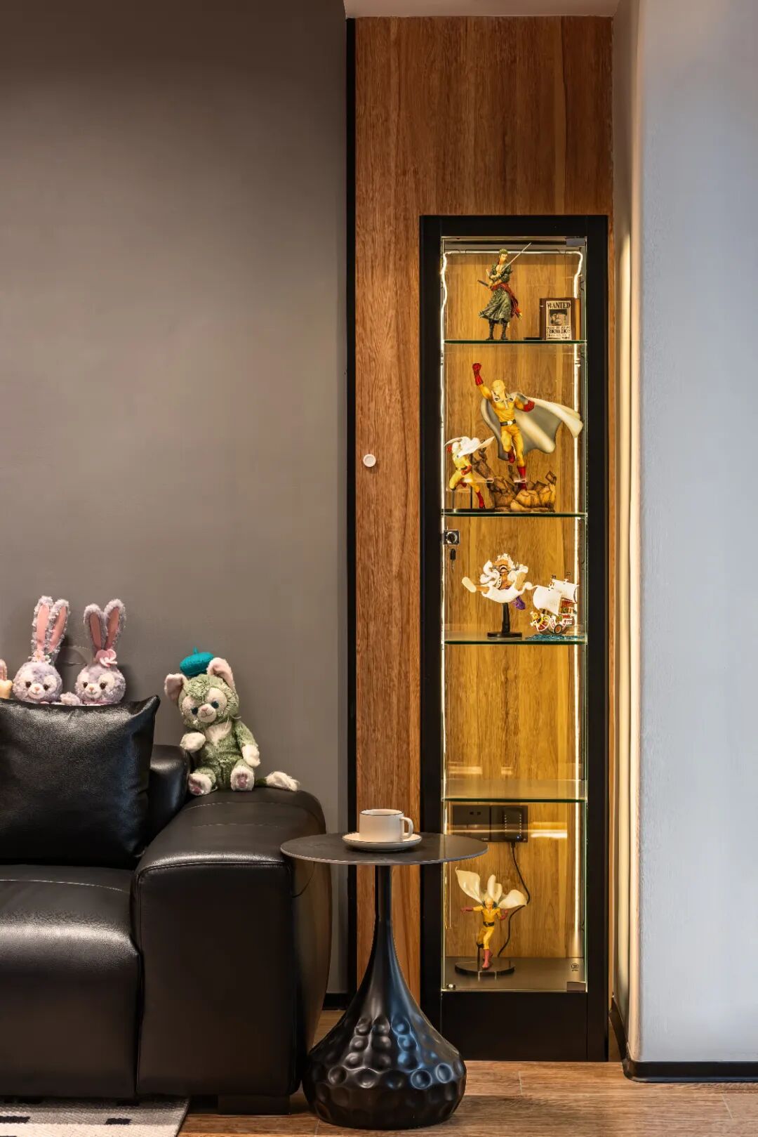 沙发上玩偶们占据最佳观景位,多层玻璃手办柜内,一拳超人、路飞等手办在专属布光下陈列,兴趣成为空间的精神注脚。