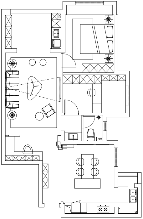 玄关右转直通餐厨区,动线清晰利落,餐厨与客厅卧室巧妙间隔,同时也把声音与气味禁锢在餐厨区。