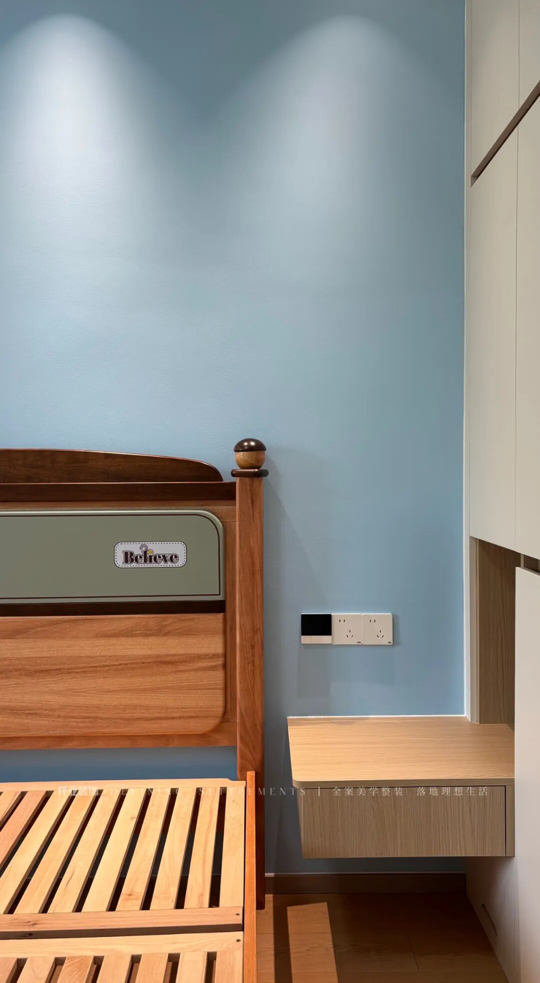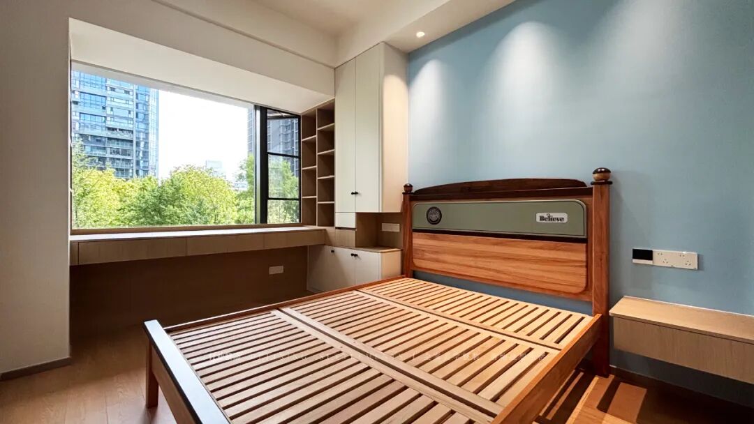 次卧则更多的是功能属性,浅蓝墙面与木质元素点睛,自然光线透过大窗洒入,窗外绿意成为动态背景。