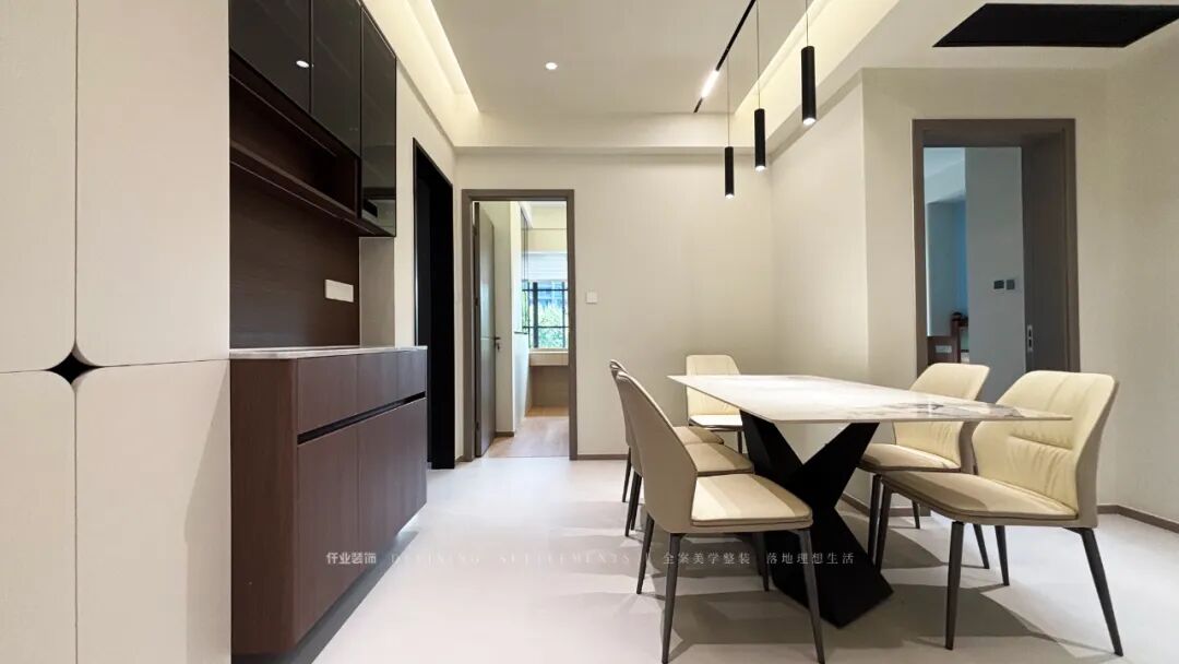 岩板餐桌搭配黑色皮质餐椅,轮廓简洁优雅,理石肌理与木饰面的柔和质感,在对比中丰富空间层次。