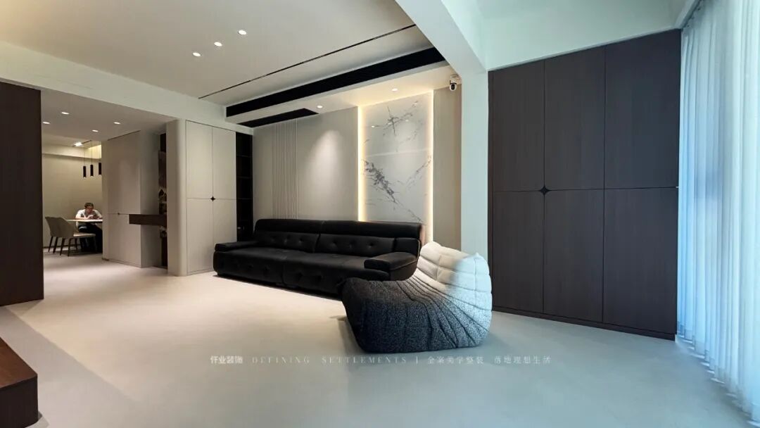 黑色线性灯带、出风口、柜体嵌入色块、深色柜体,乃至沙发,共同构成了空间深色的骨架,与大面积的白形成清晰、利落而高级的对比,仿佛一幅精致的单色素描。