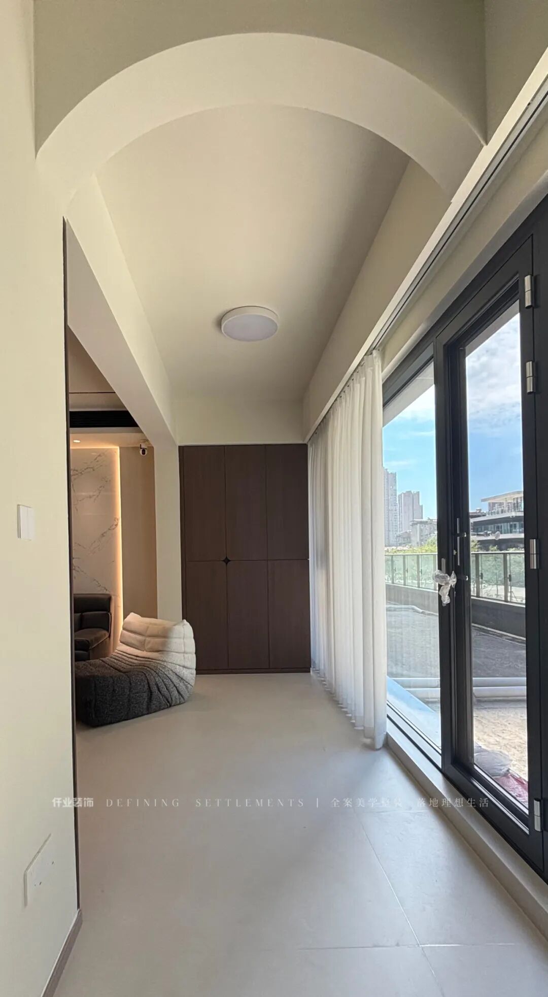 阳台以优雅的拱形造型吊顶,串联起客厅与卧室的动线,巧妙弱化了结构棱角,赋予过渡空间以柔和的艺术感。