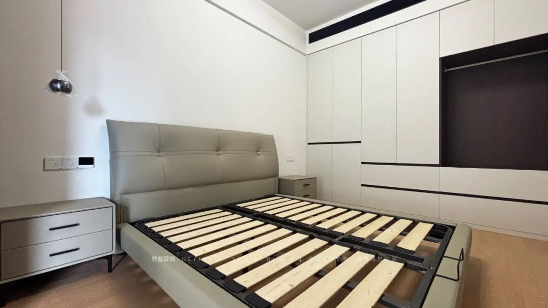 床头背景墙以浅色板材、岩板画、黑色格栅拼接,嵌入暖光灯带,烘托出温馨感。
