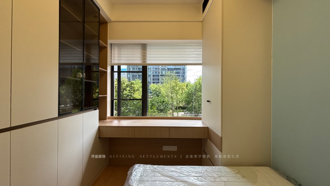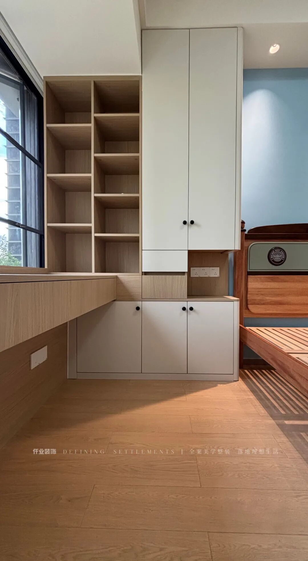 一体化木质台面兼具飘窗与工作区功能,连接定制柜体,开放架与封闭柜门结合,满足多样化收纳场景。