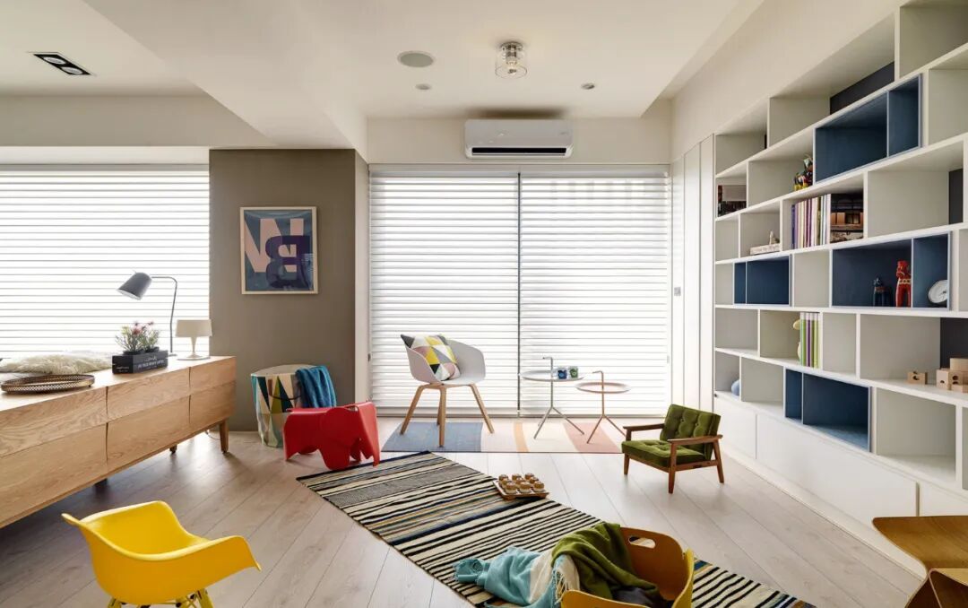 孩子需要一个有足够空间的活动区域,因此把客厅简化、减少家具量、留出空间给孩子玩耍,可以让孩子有更多地自由活动的空间。同时,在客厅中加入整墙储物柜,可以对孩子的玩具、图书等进行储藏,不仅美观而且实用,还培养了孩子的动手能力与创造力,对提高孩子的自我管理能力和减轻家长的负担都非常有帮助。