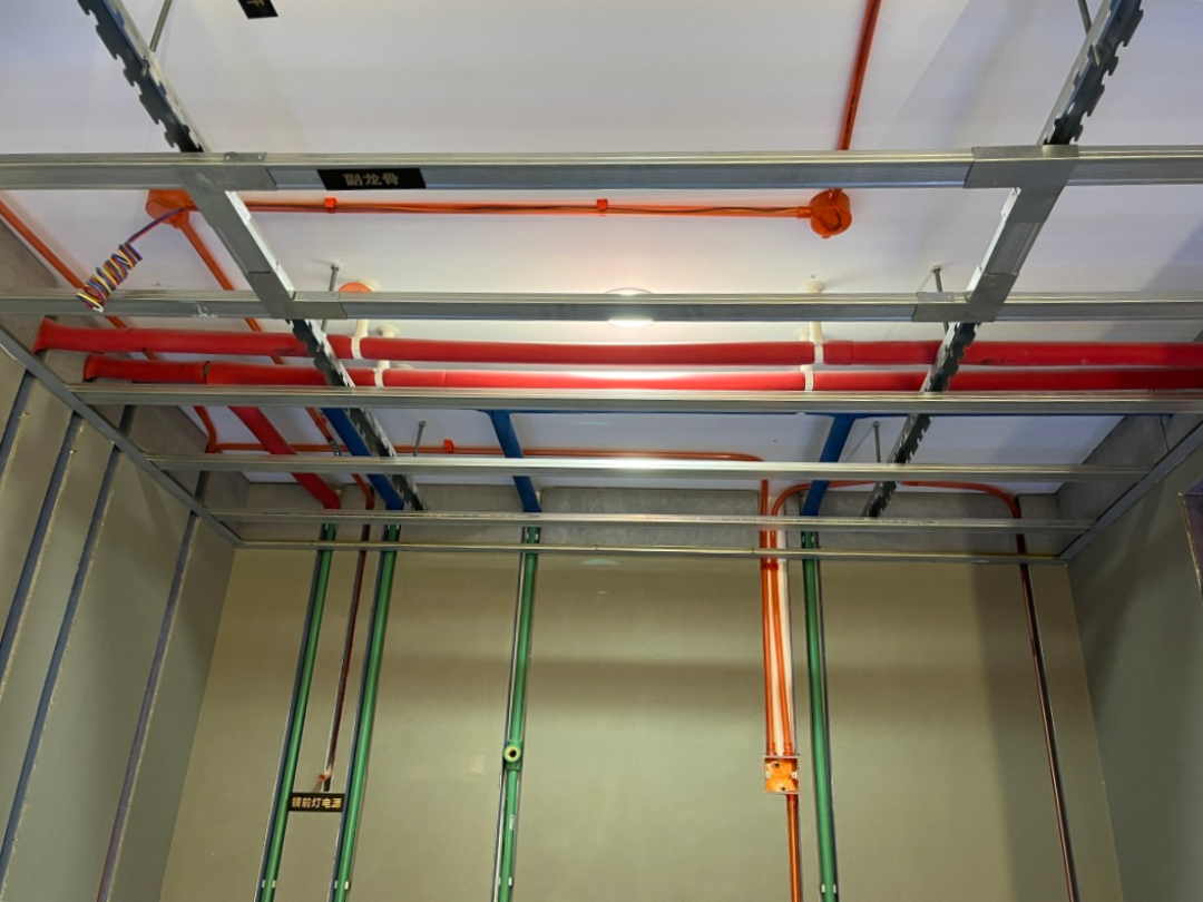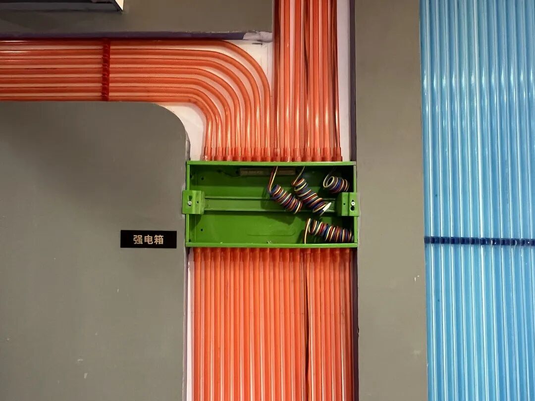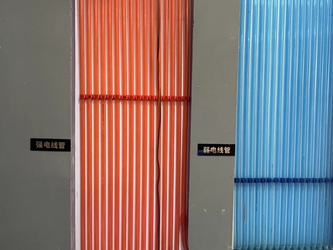 强弱电平行布置,间距不小于300mm;强弱电交叉布置时,采用铝箔纸包裹进行弱电屏蔽处理,有效避免强电电磁对网线、电视线等弱电的信号干扰。