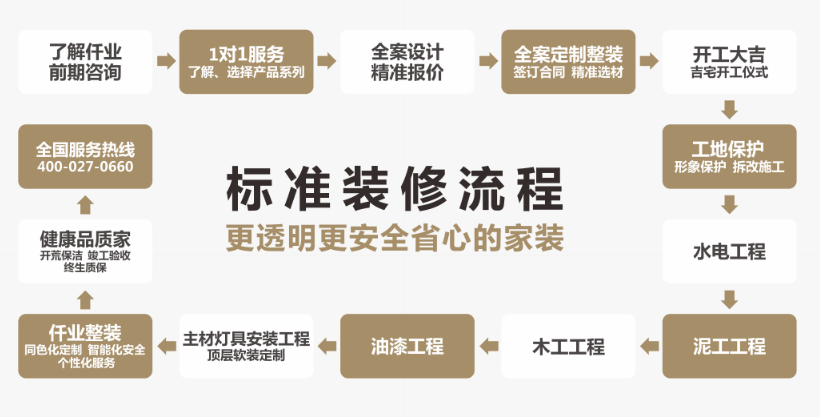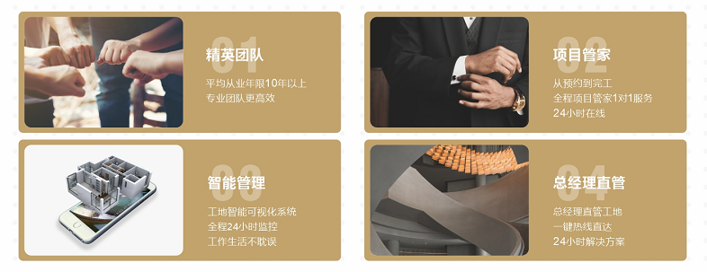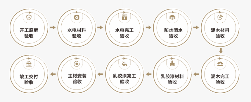 同时采用标准的交付流程,分阶段十次验收,验收合格方可进行下一阶段施工,不断攻克施工过程中的各种难题,标准之上追求极限,悦享极致美好生活。