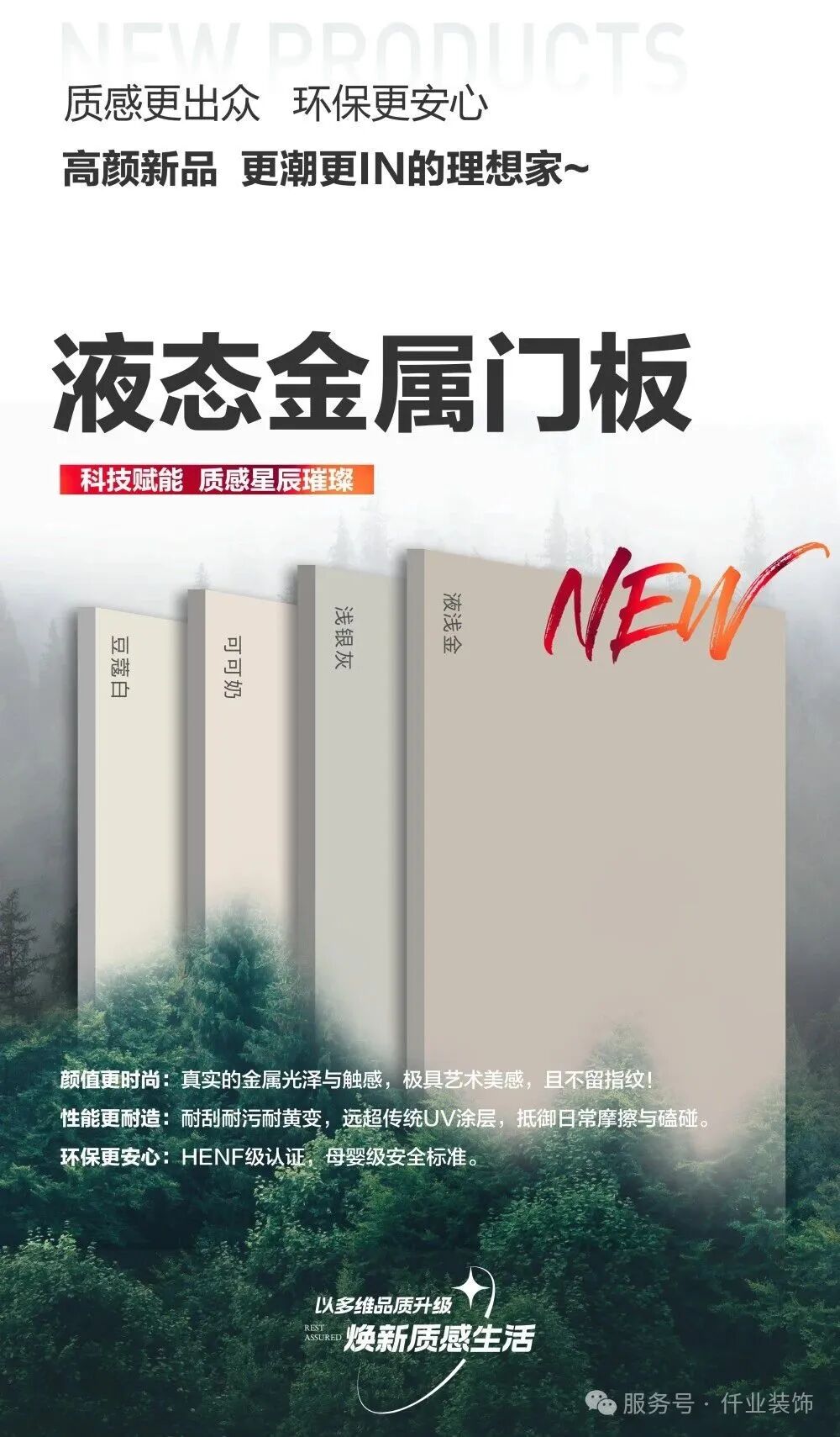 无论是简约现代还是轻奢格调,液态金属门板都能轻松驾驭。涵盖豆蔻白、可可奶、浅银灰等六种花色,从卫生间、厨房到客厅、卧室皆可应用。