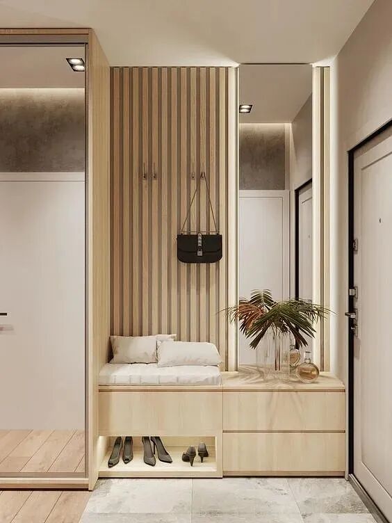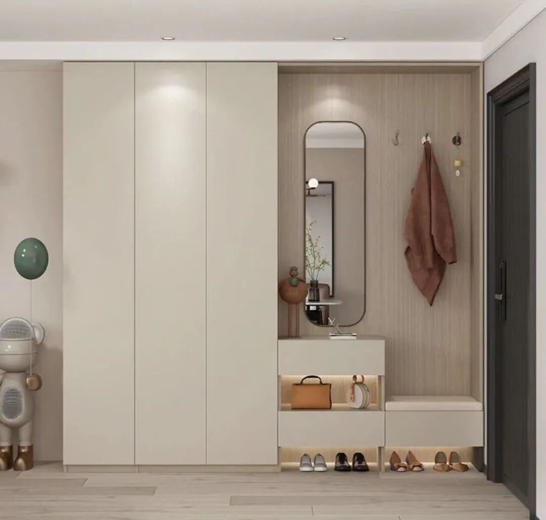 当下非常受欢迎的一种设计形式是将衣帽柜、镜面、坐凳、鞋柜一体化设计,矮柜的台面刚好可以充当换鞋凳,柜体还能满足日常储物功能,功能性和装饰性都得到了保证!