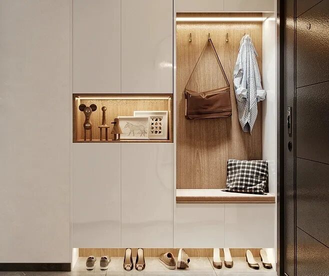 如果你家是大户型且门厅够大,可以把鞋柜、挂衣区、坐凳有效的结合在一起,做成美观的嵌入式柜体,日常脱下来的外套、更换的鞋子,都能有很好安置的地方。