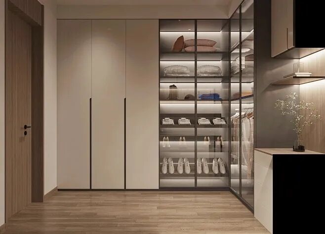 如果空间有限,穿衣镜可以和前面提到的次净衣收纳一起设计,充分利用墙面,设计一个简约的收纳区也是很不错!