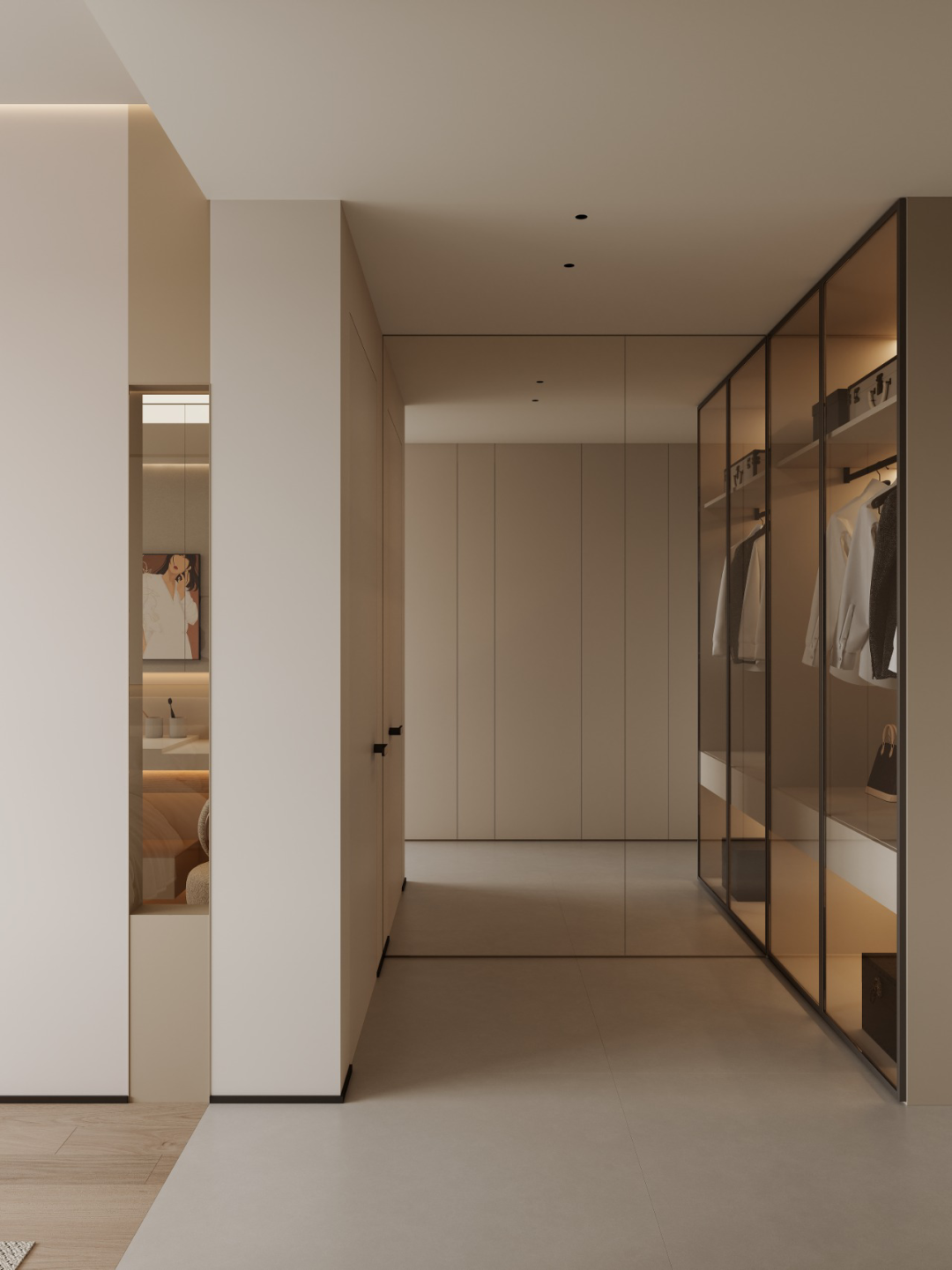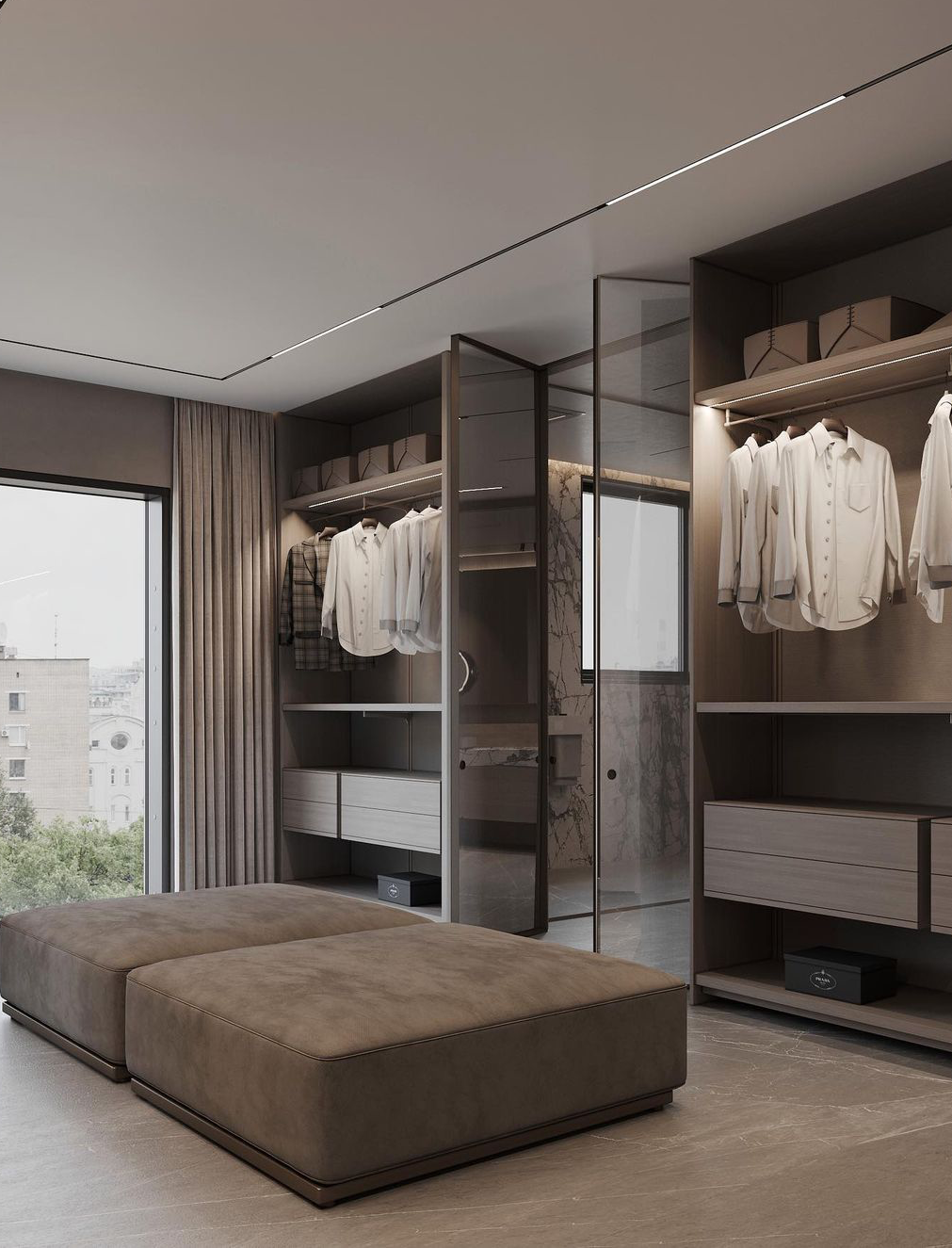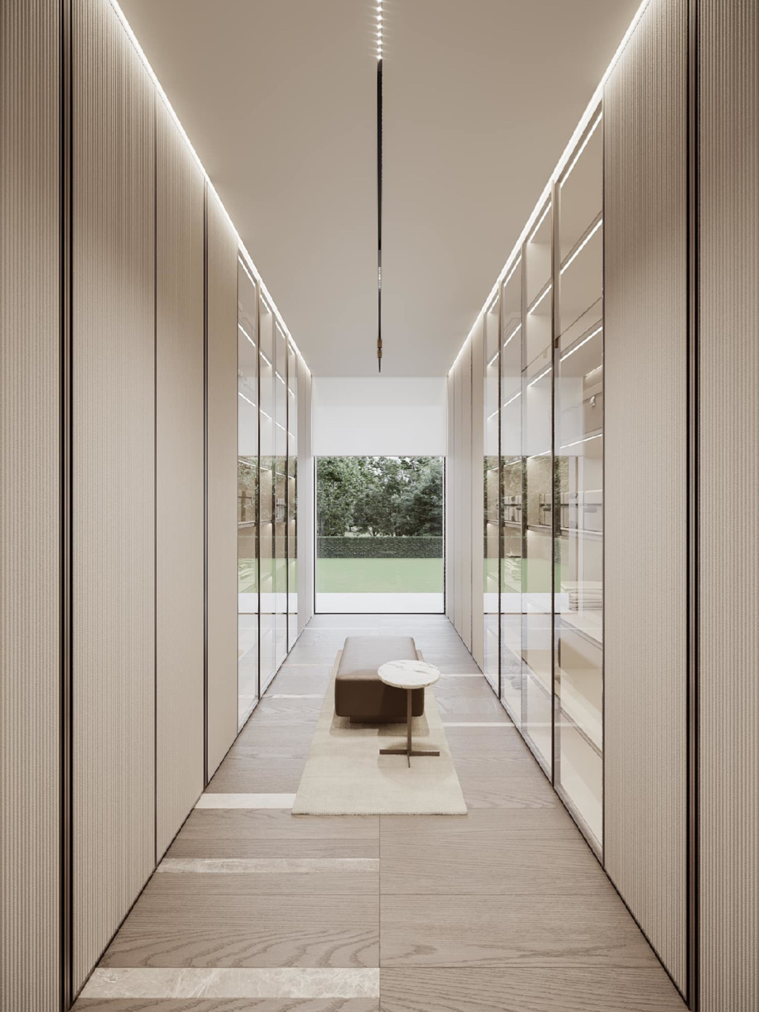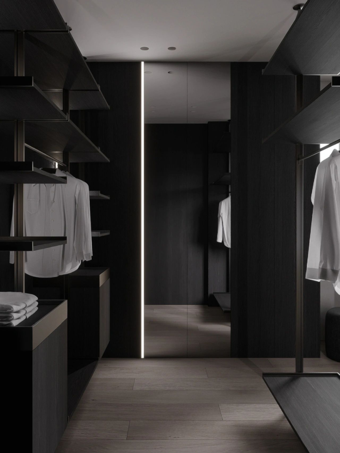 相信大部分衣帽间的面积都是有限的,所以更需要调节衣帽间的色调和照明,必不可少的灯光系统以提升空间的氛围感和纵深感。