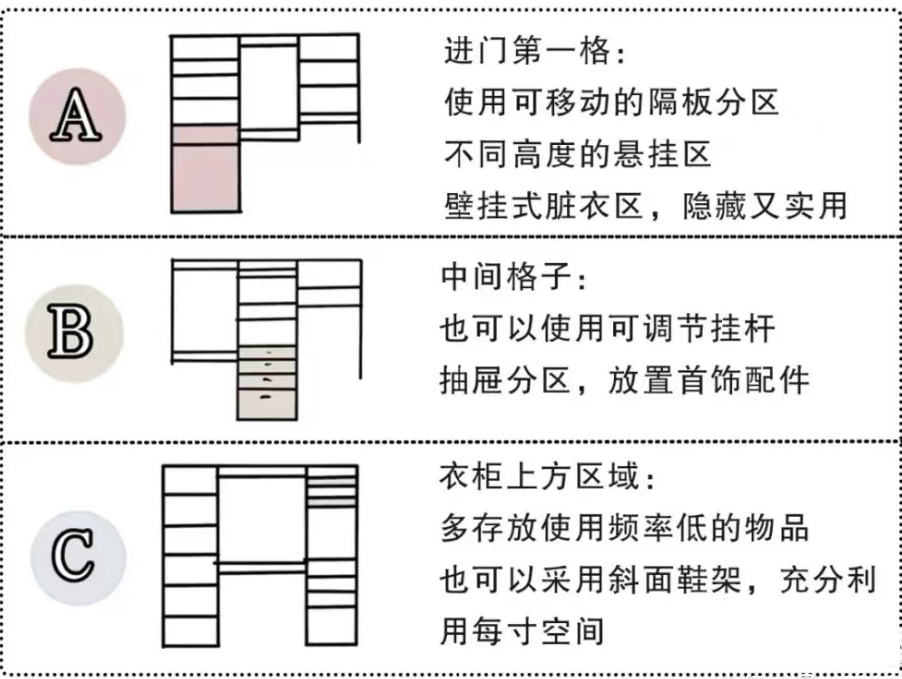 以U型衣帽间为例,分为A、B、C三个区。