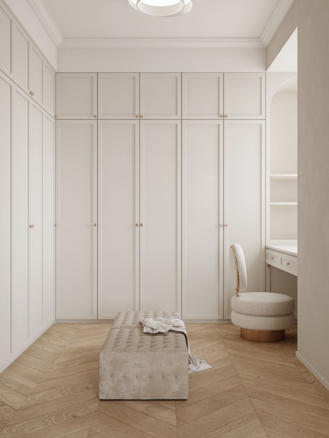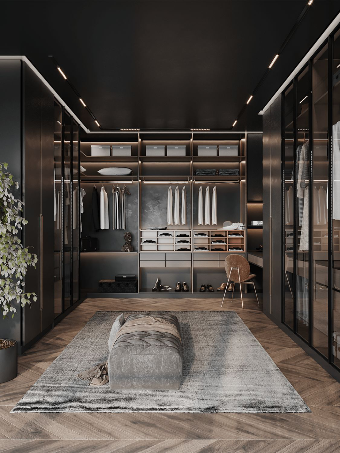 此布局的衣帽间比前三种布局利用率更高,同时对空间要求也比较高,适合面积稍大的空间,三面柜体或两面柜体+梳妆台的设计思路,让空间得到充分利用。